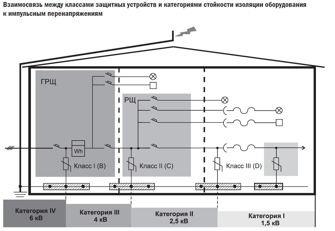 Независимо от типа используемого устройства защиты от перенапряжений, максимальное напряжение соответствует категории II. Up max = 2500 В, если Un = 230 В.
