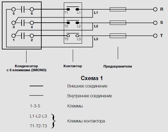 На некоторых конденсаторах производители выводит 6 зажимов для подключения, это позволяет применять контакторы меньшнй мощности.