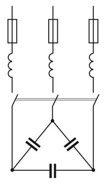 Самые популярные трехфазные конденсаторы компенсации реактивной мощности состоят из цилиндрического алюминиевого корпуса, внутри которого смонтированы три однофазных конденсатора соединенные по схеме "треугольник" (см.рис. вариант а). Подключение осуществляется через три клеммы. Также существуют модели (например от Legrand) с шестью клеммами (см.рис. вариант б) они позволяют подключать контактор в разрыв треугольника. Что в свою очередь позволяет взять контактор меньшего номинала.