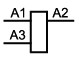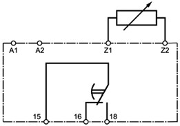 Пример маркировки выводов коммутационного устройства, имеющего: - два вывода А1 и А2 питания цепи управления; - два вывода Z1 и Z2 внешнего объединенного регулируемого резистора; - три вывода 15, 16 и 18 внутреннего переключающего контакта с выдержкой времени. |